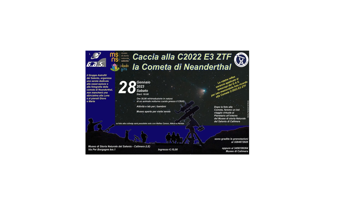 CACCIA ALLA C2022 E3 ZTF La Cometa di Neanderthal Appuntamento al Museo di Storia Naturale del Salento – Sabato 28 Gennaio: Il Gruppo Astrofili del Salento, organizza una serata dedicata all’osservazione e alla fotografia della Cometa di Neanderthal, ovviamente non mancherà una sbirciatina alla Luna…
